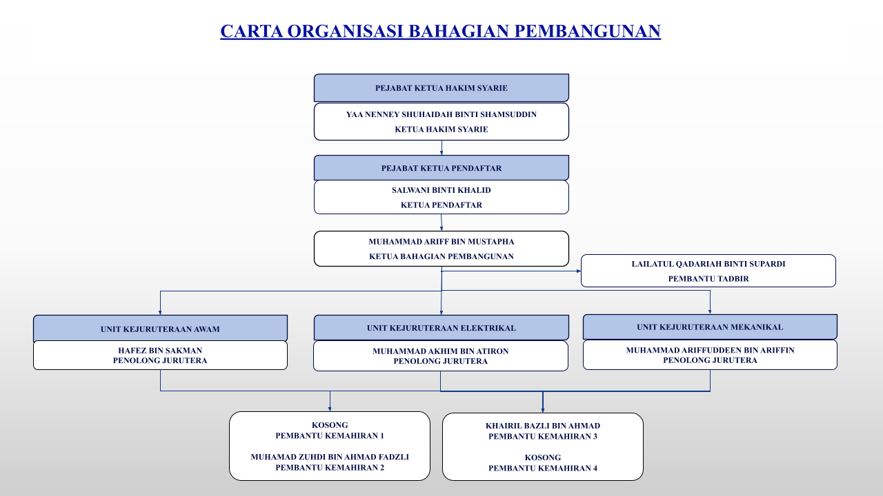 Bahagian Pembangunan yang dahulu dikenali sebagai Seksyen Pembangunan diwujudkan ditubuhkan bagi merancang, melaksana dan memantau projek pembangunan serta membaikpulih semua bangunan milik Jabatan Kehakiman Syariah Negeri Selangor.