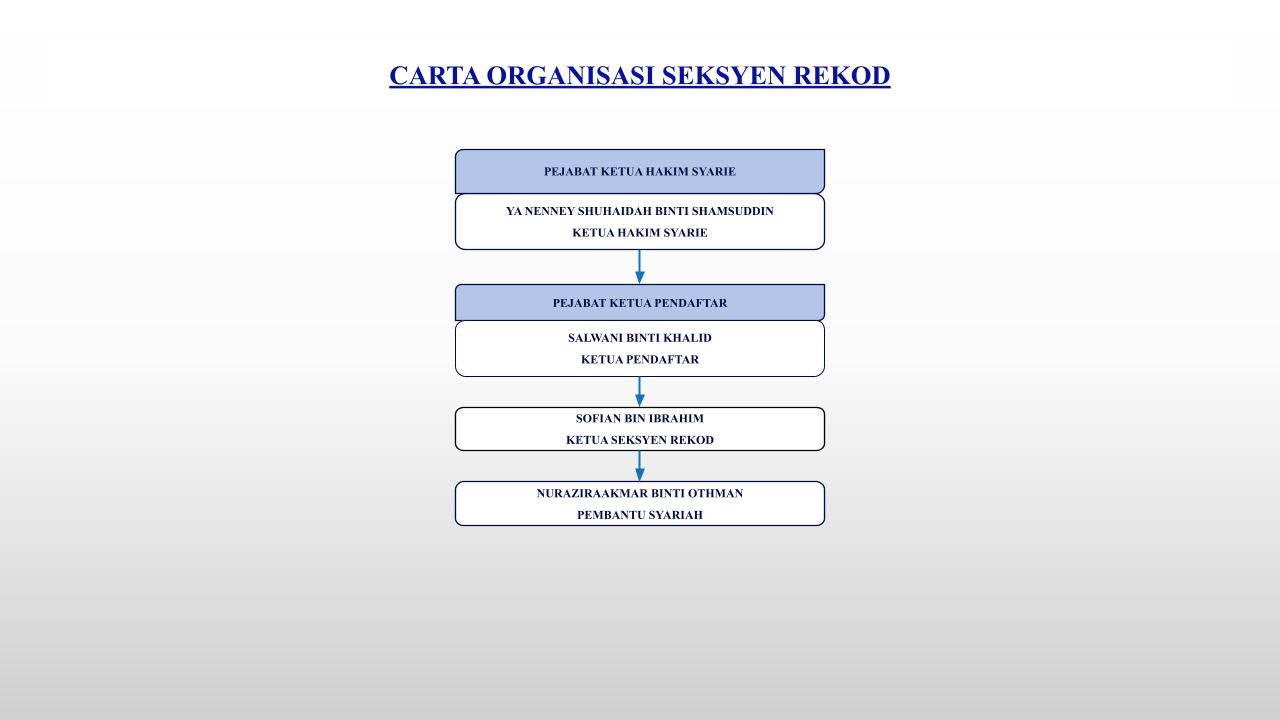 Seksyen Rekod bertanggungjawab menjadikan sistem pengurusan rekod Jabatan teratur dan bersistematik. Matlamat kami adalah ke arah menjadi pusat rujukan pengurusan rekod perundangan serta pentadbiran bagi memenuhi kepuasan pelanggan dan memastikan mencapai keberkesanan sistem pengurusan kualiti. Seksyen Rekod diwujudkan di JAKESS pada Januari 2009 dengan pengisian (2) dua perjawatan oleh Jabatan Kehakiman Syariah Malaysia.