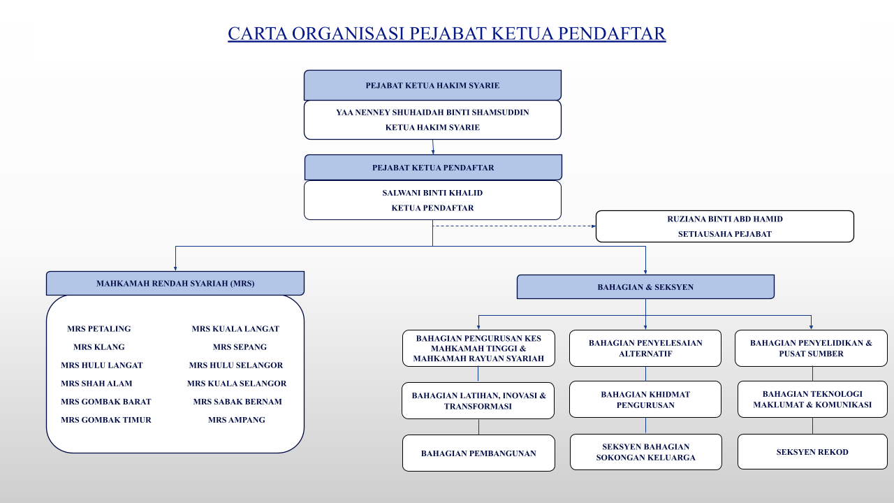 Pejabat Ketua Pendaftar yang diterajui oleh Ketua Pendaftar untuk memantau semua Pengurusan bagi Bahagian-bahagian dan Mahkamah Rendah Syariah yang wujud di Jabatan Kehakiman Syariah Selangor.